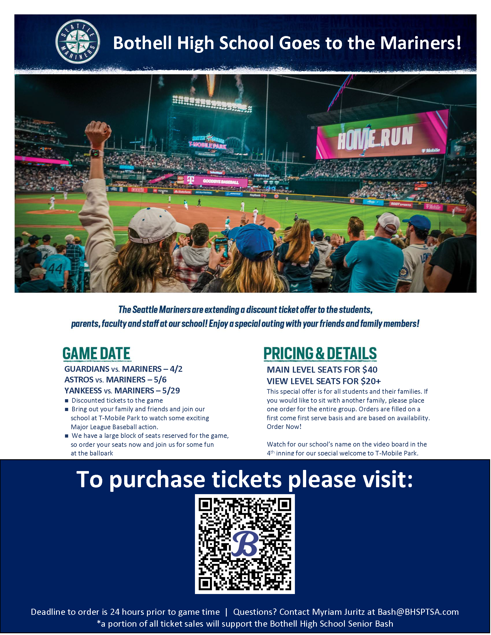 BHS PTSA Mariner Tickets are at least HALF PRICE. You get a discounted ticket and the Senior Party gets a donation. The Astros game is sold out, this is the only way to get a ticket. The opening weekend tickets are almost sold out. The Yankees always sell out. We will lose our hold on tickets if we don’t sell a bunch by Monday March 13th. Click HERE to get your tickets today and pass THIS flyer along to your friends too!