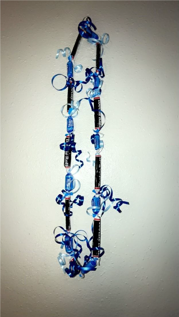 Small candy lei made with tootsie rolls, tootsie fruit chews and ribbon